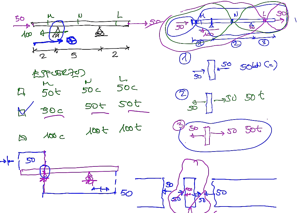 Buenas tardes, Me surge una duda, en el apoyo con reacción horizontal la función de la ley de esfuerzo axil se hace discontinua, ¿cierto? Es decir, justo a la izquierda de la rebanada vale 50 kn a compresión pero justo a su derecha vale 50 kn a tracción, es decir habría un salto y en teoría a la...