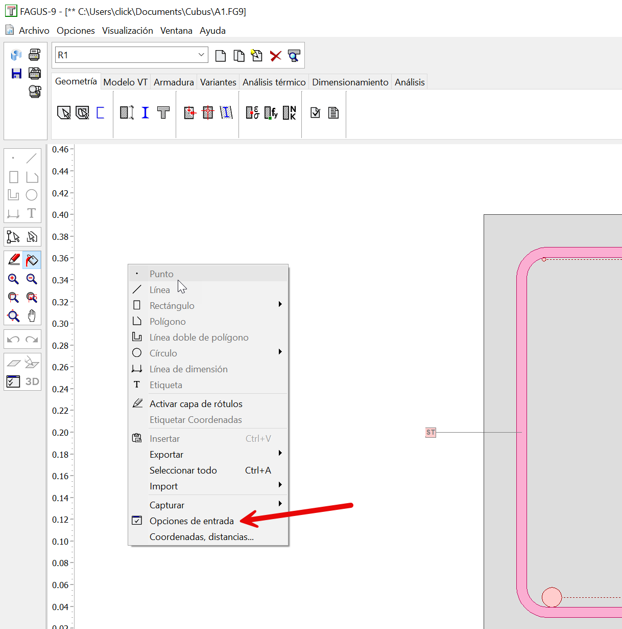 Nos hemos dado cuenta de que sí se puede quitar, pero no te aconsejamos que lo hagas porque suele ser muy útil para ver si las dimensiones de la sección son las correctas o las posiciones de la fibra neutra (yo a veces muevo la sección hasta un borde para "medir a ojo". En cualquier caso, si quieres quitar las regla horizontales y verticales basta con que presiones el botón de la derecha del ratón en cualquier parte de la pantalla, selecciones "Opciones de entrada"...