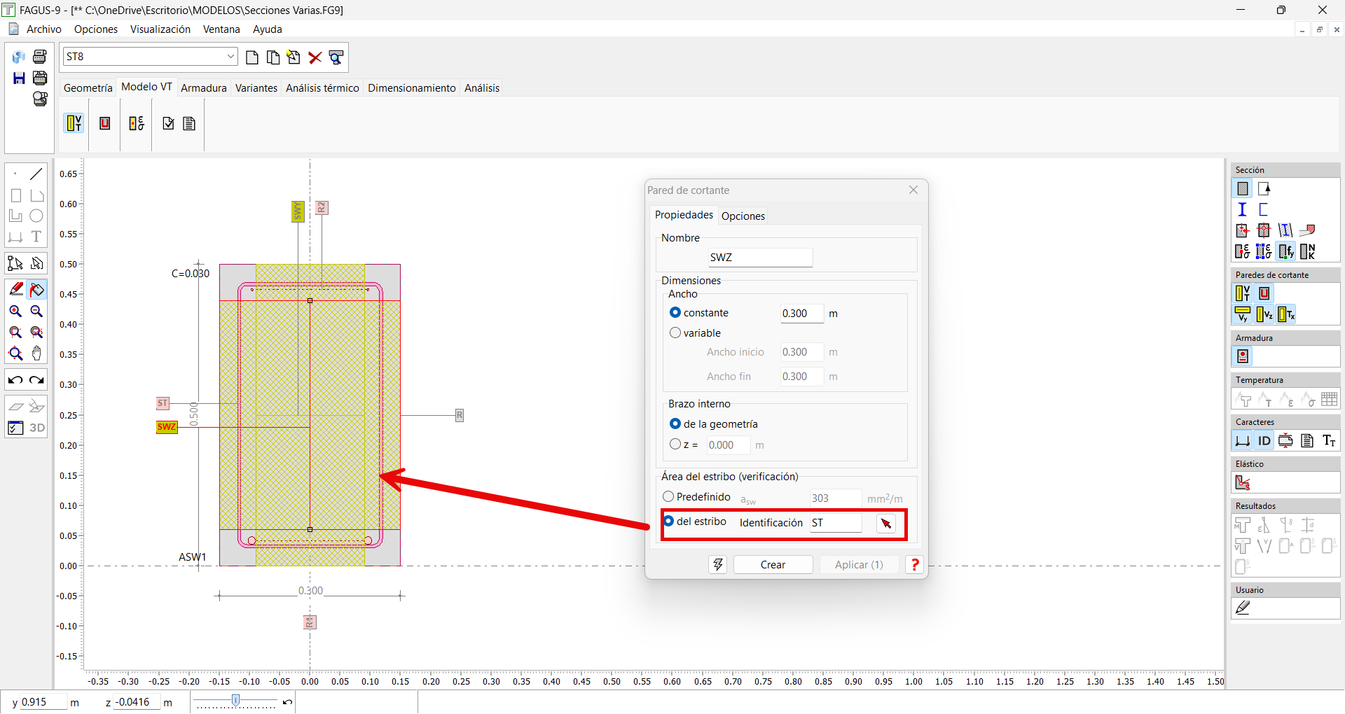 Deberemos asegurarnos que el estribo asignado a las paredes de cortante está definido en la pestaña Modelo V-T, o bien que hemos asignado un área de armadura de cortante a la misma: