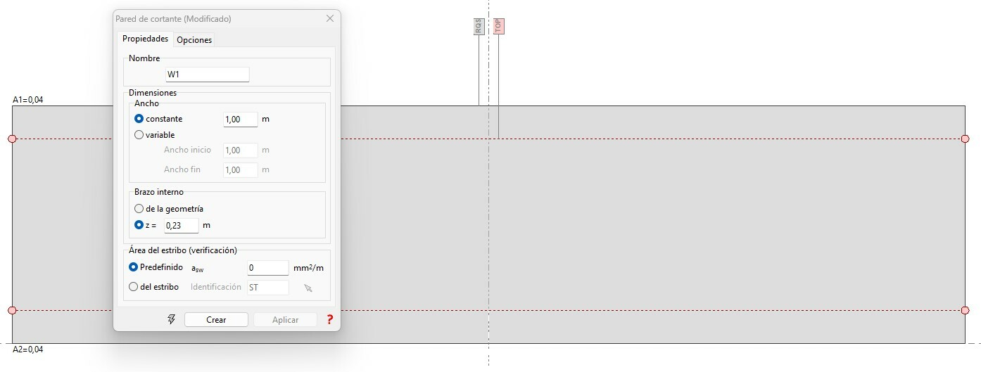 En cualquier caso si deseamos crear una nueva, bastará con borrarlas y después crear una nueva definiendo el ancho de la pared de cortante y pulsando crear: