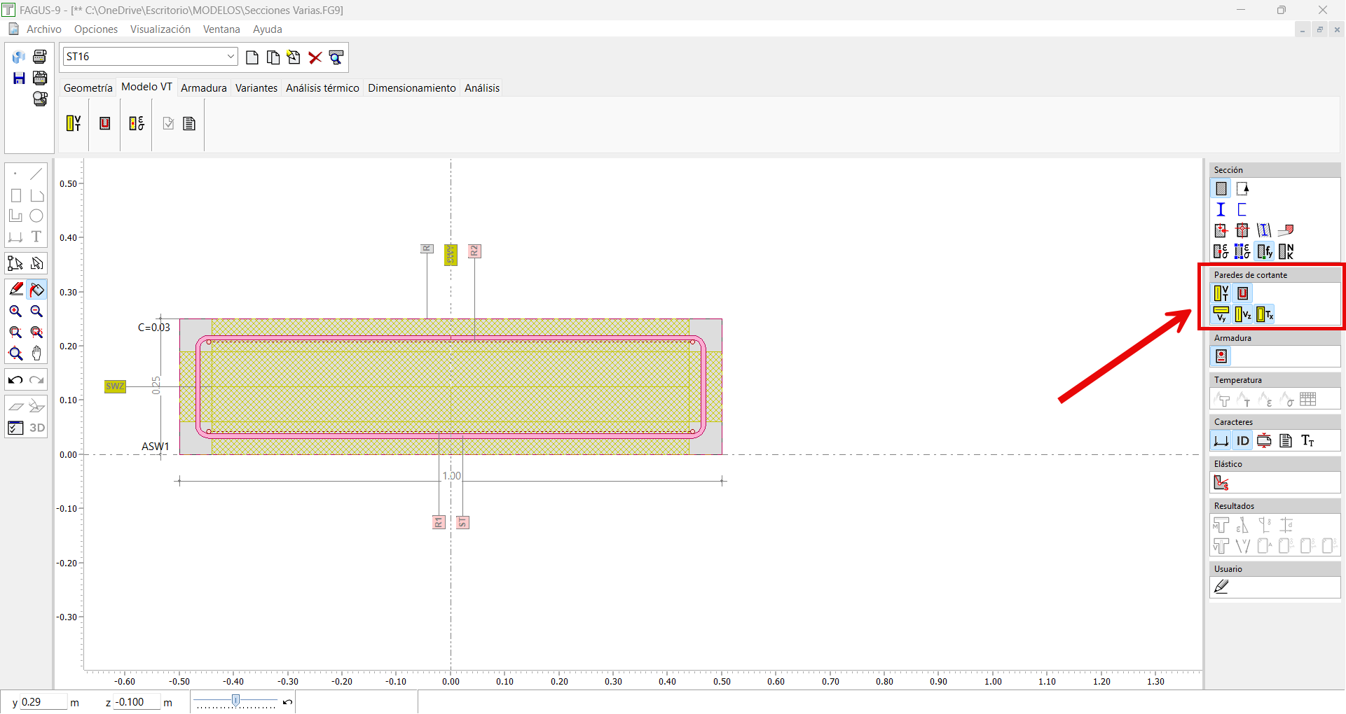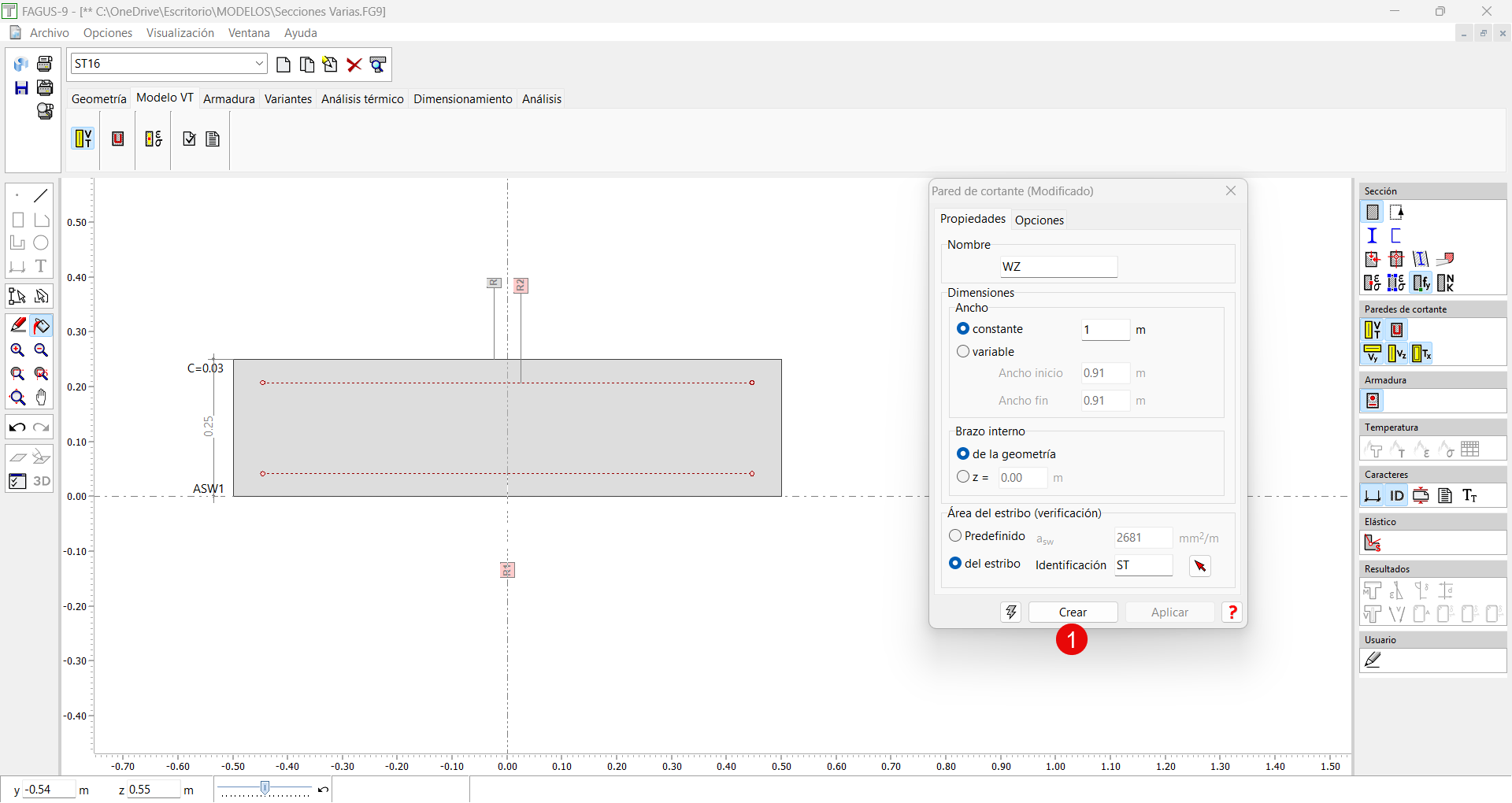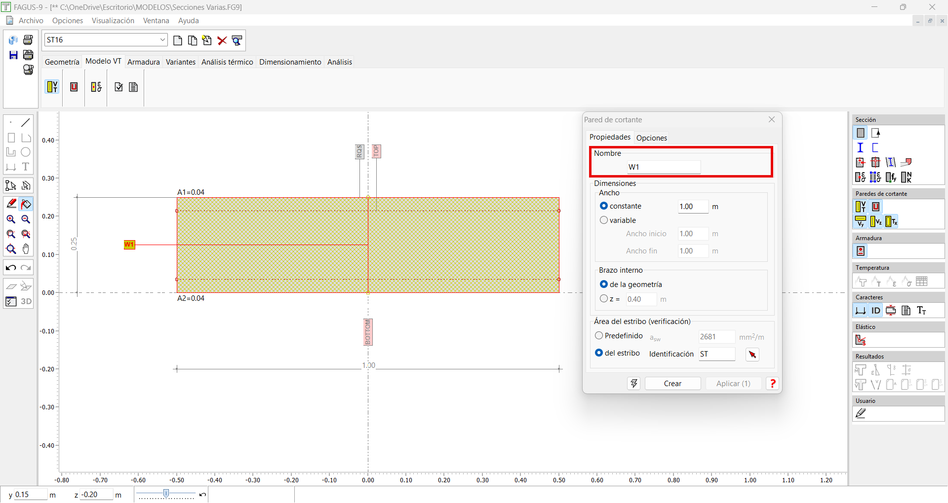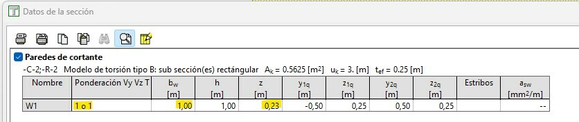 He introducido una sección parametrizada rectangular (una losa) de 1x0,25 m, y luego he pinchado en convertir. Quiero crear una pared de cortante para resistir Vz, por lo que en la pestaña Modelo VT pincho en el icono pared de cortante, y selecciono ancho 1 m y z=0,23 (0,9·d) Si pincho en crear me sale un mensaje de error diciendo que el diálogo tiene valores sin definir. Como quiero que la sección aguante a cortante Vz, en la pestaña opciones, señalo los factores Vy=0, Vz=1, T=1 Le doy al icono crear y señalo las dos esquinas superiores del rectángulo. Inmediatamente me crea un área de cortante tremenda Aunque si pincho en el icono leyenda de paredes de cortante, parece que los datos de bw=1 y z=0,23 son los que yo he metido, por lo que no entiendo por qué dibuja un área de cortante tan grande. Por otro lado, veo que la ponderación Vy Vz T no es la que yo he metido. ¿Qué es lo que estoy haciendo mal?