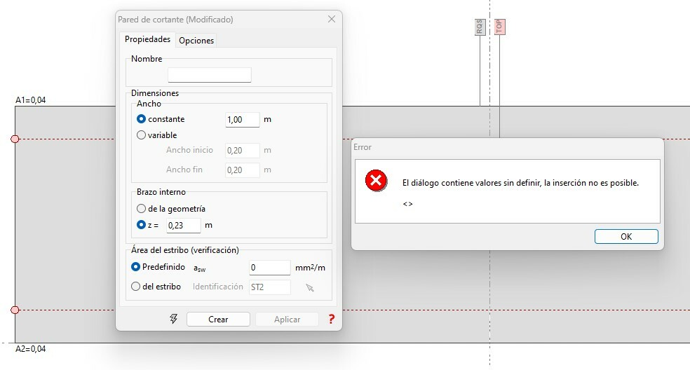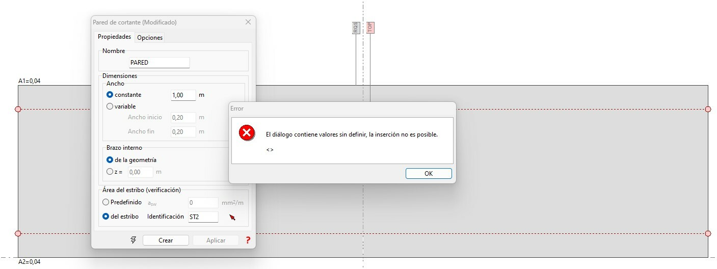Por otro lado, al intentar crearla, escribo un nombre para la pared, le doy el ancho y el brazo, le doy a crear y sale el mensaje de error (en la imagen se ve que la pared de cortante no tiene nombre, pero se ha borrado en cuanto pinché en crear)