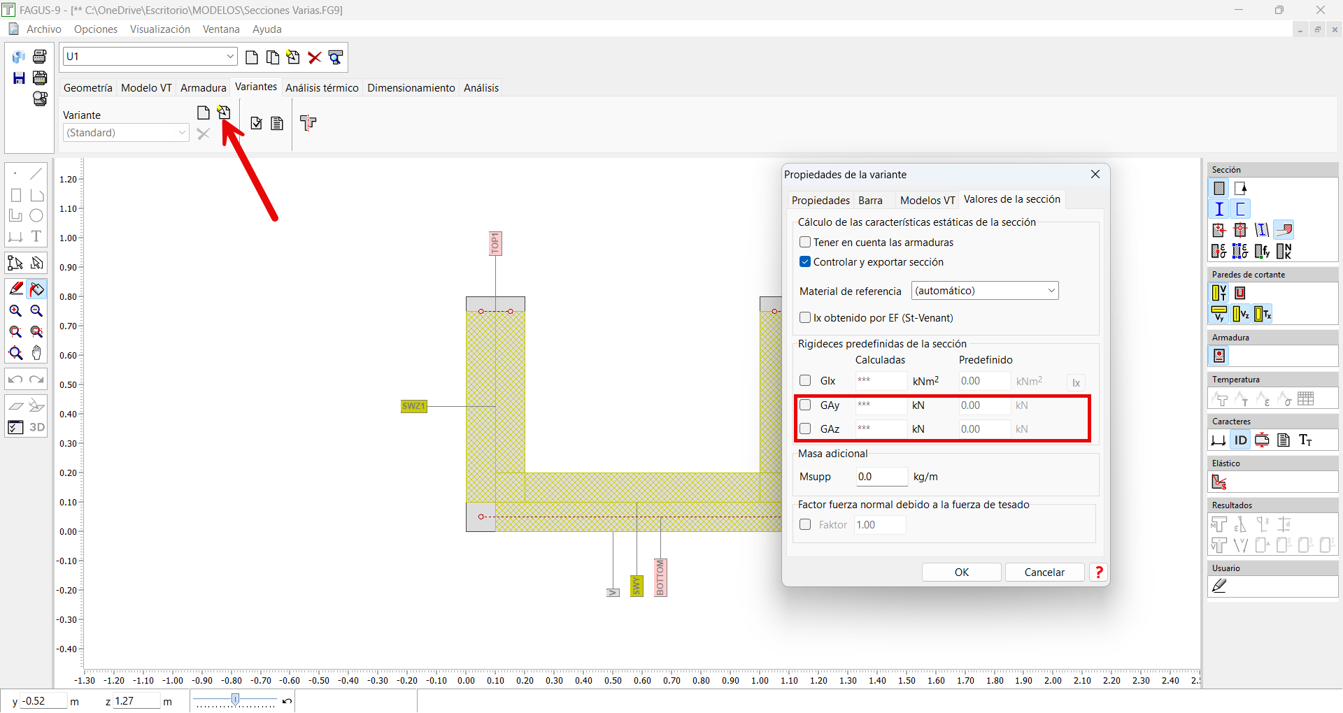 En cuanto a las áreas Ay y Az estas se utilizan para la consideración de las deformaciones a cortante. Por defecto se asignan valores igual a 1, pero se pueden editar en las propiedades de la variante: