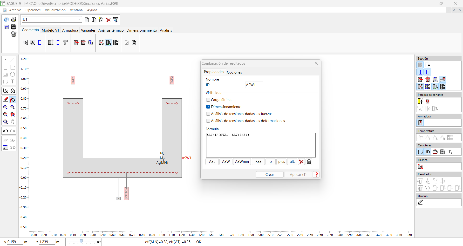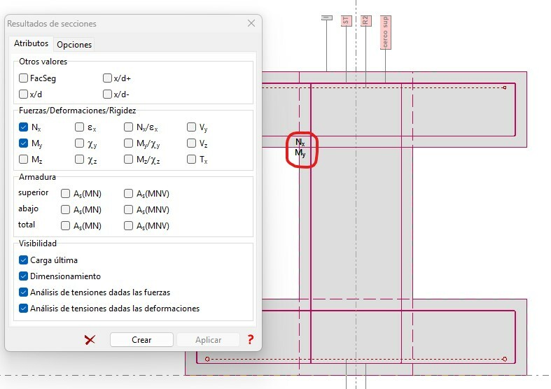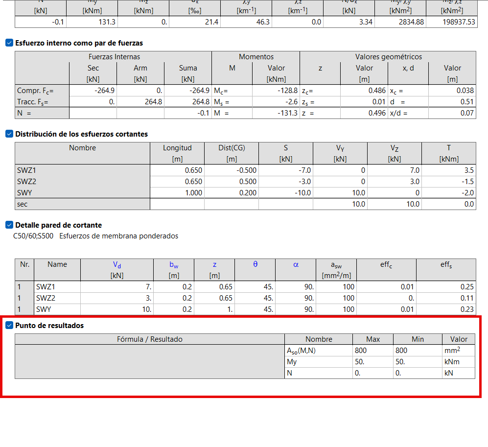 Los resultados de la sección se muestran tanto en la salida gráfica de resultados como en la numérica:
