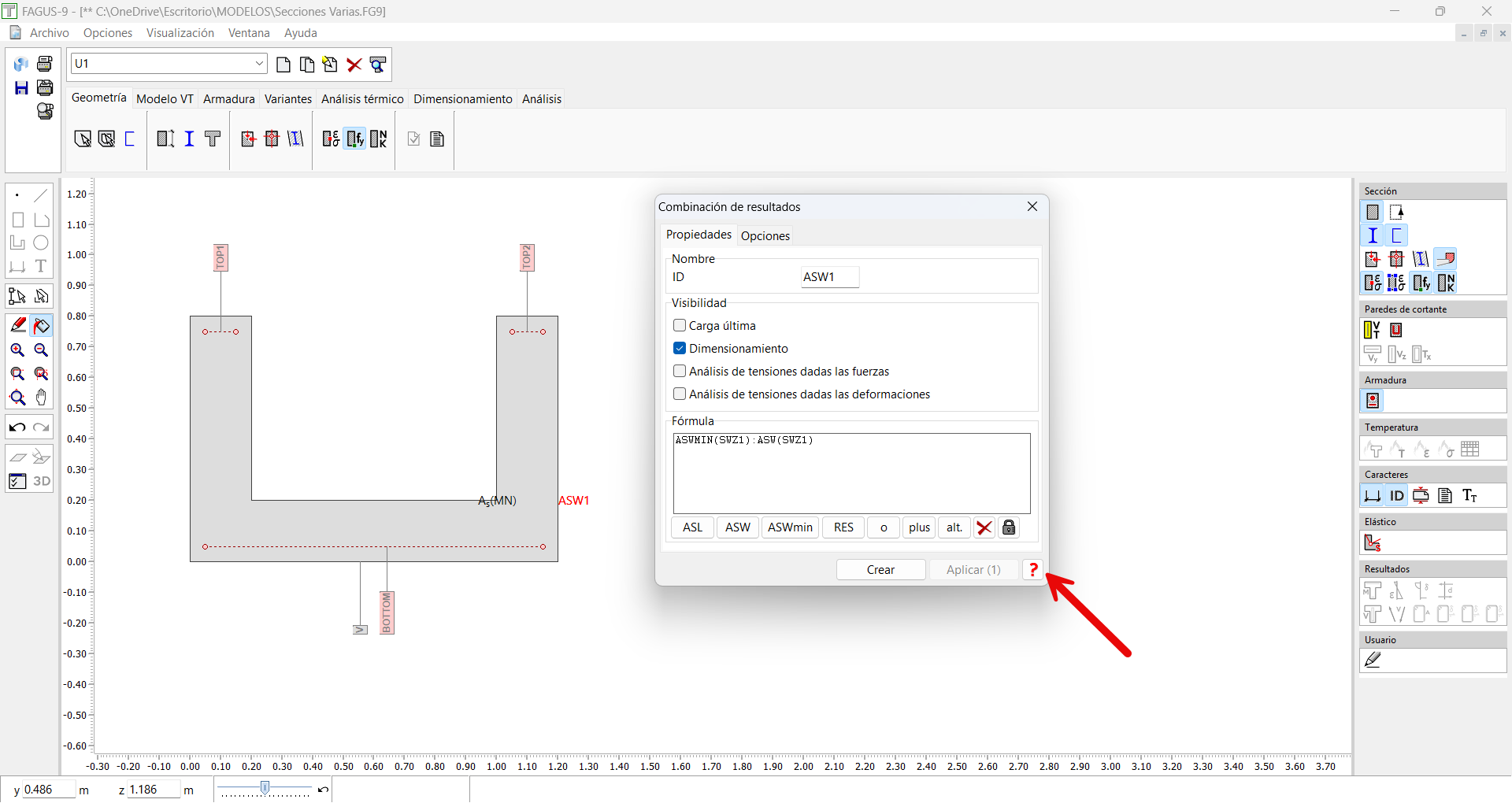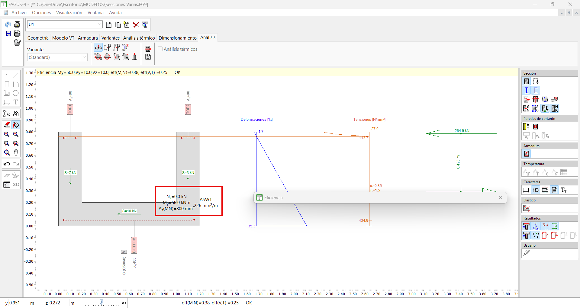Por otro lado, estoy usando el icono Resultados de la sección, metiendo un punto dentro de la sección, pero después de meter cargas en la pestaña Análisis, icono Eficiencia, no consigo ver los esfuerzos en ese punto.