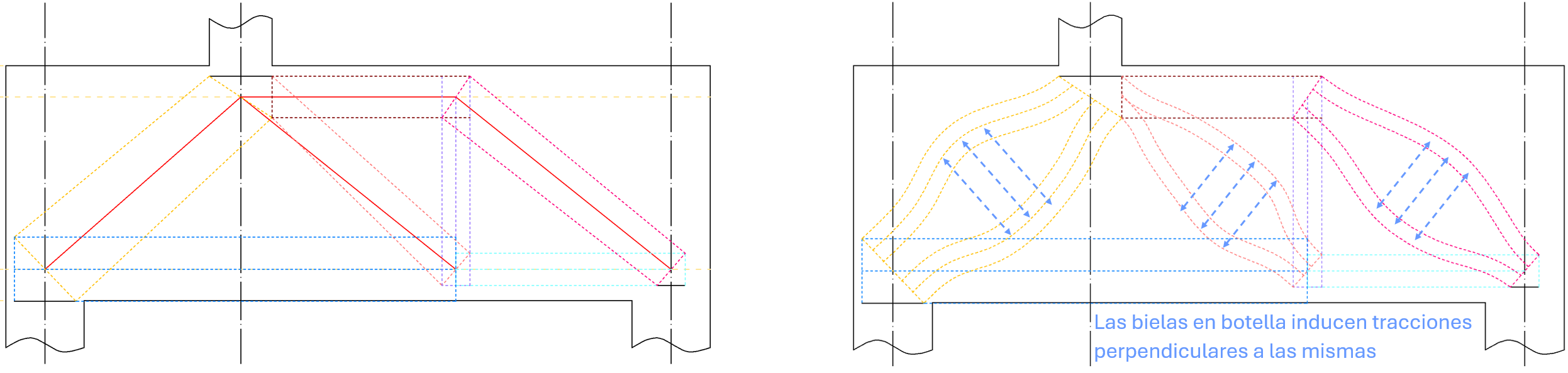 Pero, además en la zona del tirante vertical las bielas en botella también incrementan las tracciones por lo que seria necesario tener en cuenta esa sobreabundancia de cercos.